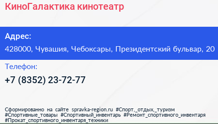 КиноГалактика, кинотеатр по адресу 428000, Чувашия, Чебоксары, Президентский бульвар, 20 в дальнейшем Организация, размещена в следующих категориях: