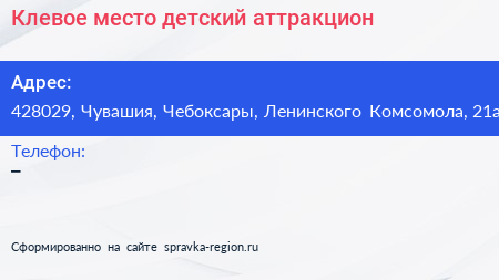 Клевое место, детский аттракцион по адресу 428029, Чувашия, Чебоксары, Ленинского Комсомола, 21а в дальнейшем Организация, размещена в следующих категориях: