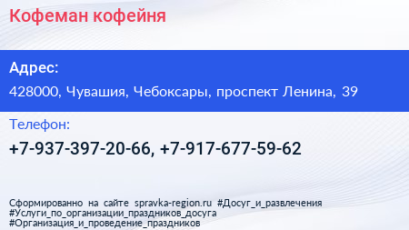 Кофеман, кофейня по адресу 428000, Чувашия, Чебоксары, проспект Ленина, 39 в дальнейшем Организация, размещена в следующих категориях: