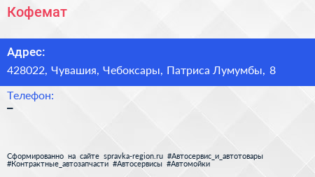 Кофемат по адресу 428022, Чувашия, Чебоксары, Патриса Лумумбы, 8 в дальнейшем Организация, размещена в следующих категориях: