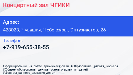 Концертный зал, ЧГИКИ по адресу 428023, Чувашия, Чебоксары, Энтузиастов, 26 в дальнейшем Организация, размещена в следующих категориях: