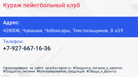 Кураж, пейнтбольный клуб по адресу 428008, Чувашия, Чебоксары, Текстильщиков, 8 к19 в дальнейшем Организация, размещена в следующих категориях: