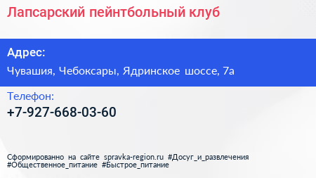 Лапсарский, пейнтбольный клуб по адресу Чувашия, Чебоксары, Ядринское шоссе, 7а в дальнейшем Организация, размещена в следующих категориях: