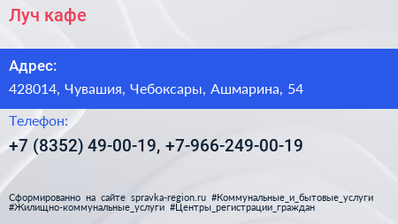 Луч, кафе по адресу 428014, Чувашия, Чебоксары, Ашмарина, 54 в дальнейшем Организация, размещена в следующих категориях: