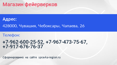 Магазин фейерверков по адресу 428000, Чувашия, Чебоксары, Чапаева, 26 в дальнейшем Организация, размещена в следующих категориях: