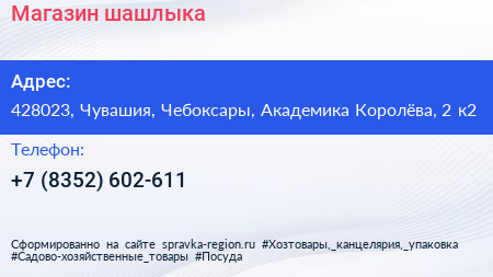 Магазин шашлыка по адресу 428023, Чувашия, Чебоксары, Академика Королёва, 2 к2 в дальнейшем Организация, размещена в следующих категориях: