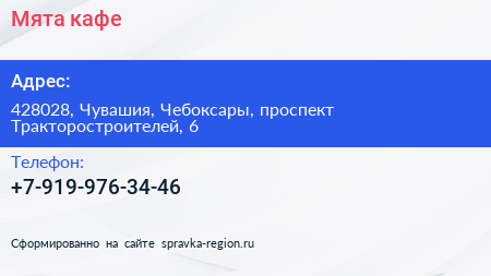 Мята, кафе по адресу 428028, Чувашия, Чебоксары, проспект Тракторостроителей, 6 в дальнейшем Организация, размещена в следующих категориях: