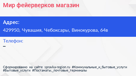 Мир фейерверков, магазин по адресу 429950, Чувашия, Чебоксары, Винокурова, 64в в дальнейшем Организация, размещена в следующих категориях: