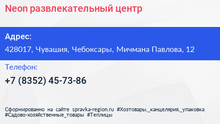 Neon, развлекательный центр по адресу 428017, Чувашия, Чебоксары, Мичмана Павлова, 12 в дальнейшем Организация, размещена в следующих категориях: