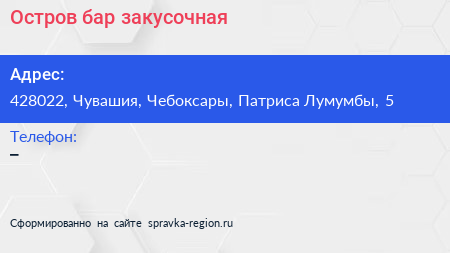 Остров, бар-закусочная по адресу 428022, Чувашия, Чебоксары, Патриса Лумумбы, 5 в дальнейшем Организация, размещена в следующих категориях: