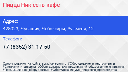Пицца-Ник, сеть кафе по адресу 428023, Чувашия, Чебоксары, Эльменя, 12 в дальнейшем Организация, размещена в следующих категориях: