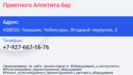Приятного Аппетита, бар по адресу 428010, Чувашия, Чебоксары, Ягодный переулок, 2 в дальнейшем Организация, размещена в следующих категориях: