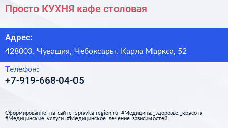 Просто КУХНЯ, кафе-столовая по адресу 428003, Чувашия, Чебоксары, Карла Маркса, 52 в дальнейшем Организация, размещена в следующих категориях: