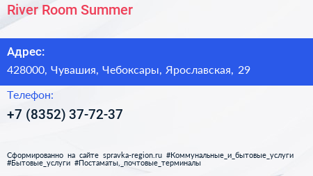 River Room & Summer по адресу 428000, Чувашия, Чебоксары, Ярославская, 29 в дальнейшем Организация, размещена в следующих категориях: