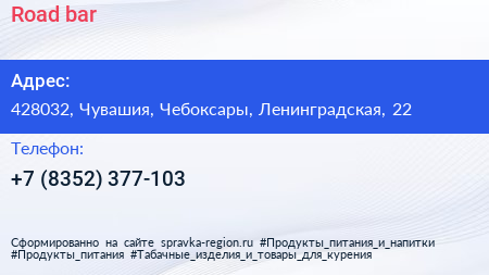 Road bar по адресу 428032, Чувашия, Чебоксары, Ленинградская, 22 в дальнейшем Организация, размещена в следующих категориях: