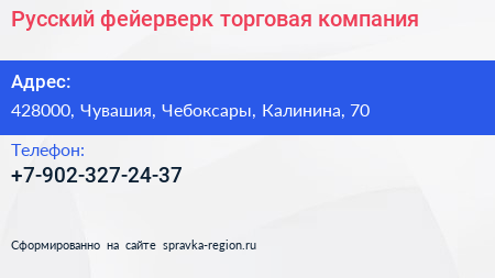 Русский фейерверк, торговая компания по адресу 428000, Чувашия, Чебоксары, Калинина, 70 в дальнейшем Организация, размещена в следующих категориях: