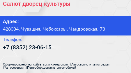 Салют, дворец культуры по адресу 428034, Чувашия, Чебоксары, Чандровская, 73 в дальнейшем Организация, размещена в следующих категориях: