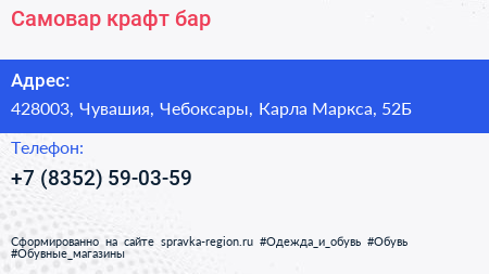 Самовар, крафт-бар по адресу 428003, Чувашия, Чебоксары, Карла Маркса, 52Б в дальнейшем Организация, размещена в следующих категориях: