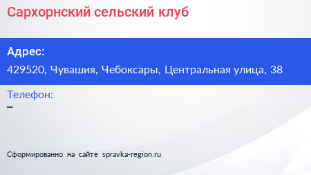 Сархорнский сельский клуб по адресу 429520, Чувашия, Чебоксары, Центральная улица, 38 в дальнейшем Организация, размещена в следующих категориях: