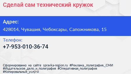 Сделай сам, технический кружок по адресу 428014, Чувашия, Чебоксары, Сапожникова, 15 в дальнейшем Организация, размещена в следующих категориях: