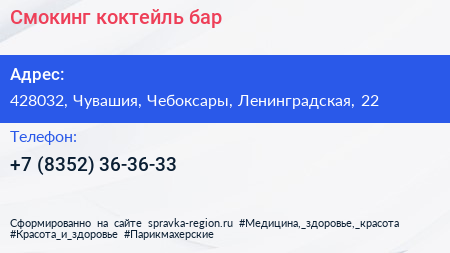 Смокинг, коктейль-бар по адресу 428032, Чувашия, Чебоксары, Ленинградская, 22 в дальнейшем Организация, размещена в следующих категориях: