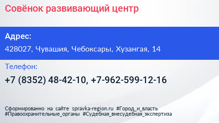 Совёнок, развивающий центр по адресу 428027, Чувашия, Чебоксары, Хузангая, 14 в дальнейшем Организация, размещена в следующих категориях: