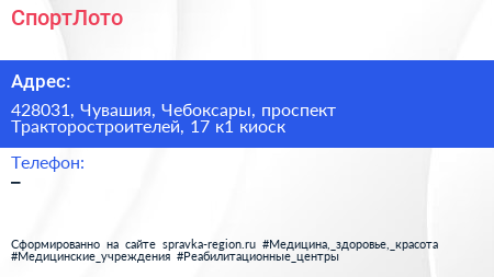 СпортЛото по адресу 428031, Чувашия, Чебоксары, проспект Тракторостроителей, 17 к1 киоск в дальнейшем Организация, размещена в следующих категориях: