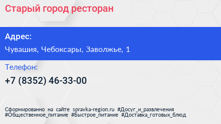 Старый город, ресторан по адресу Чувашия, Чебоксары, Заволжье, 1 в дальнейшем Организация, размещена в следующих категориях: