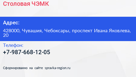 Столовая, ЧЭМК по адресу 428000, Чувашия, Чебоксары, проспект Ивана Яковлева, 20 в дальнейшем Организация, размещена в следующих категориях:
