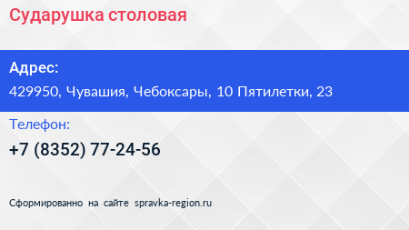 Сударушка, столовая по адресу 429950, Чувашия, Чебоксары, 10 Пятилетки, 23 в дальнейшем Организация, размещена в следующих категориях: