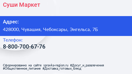 Суши-Маркет по адресу 428000, Чувашия, Чебоксары, Энгельса, 7Б в дальнейшем Организация, размещена в следующих категориях: