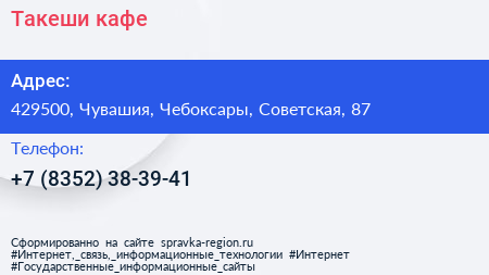 Такеши, кафе по адресу 429500, Чувашия, Чебоксары, Советская, 87 в дальнейшем Организация, размещена в следующих категориях: