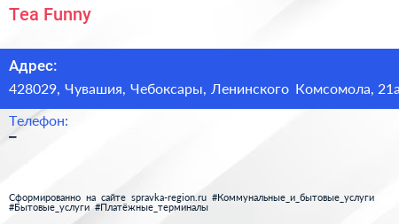 Tea Funny по адресу 428029, Чувашия, Чебоксары, Ленинского Комсомола, 21а в дальнейшем Организация, размещена в следующих категориях:
