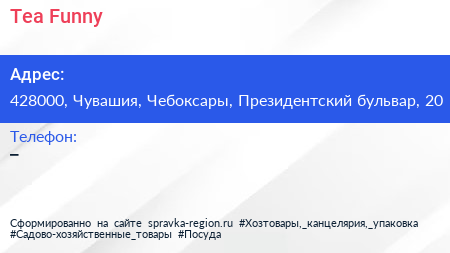 Tea Funny по адресу 428000, Чувашия, Чебоксары, Президентский бульвар, 20 в дальнейшем Организация, размещена в следующих категориях: