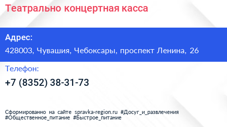 Театрально-концертная касса по адресу 428003, Чувашия, Чебоксары, проспект Ленина, 26 в дальнейшем Организация, размещена в следующих категориях: