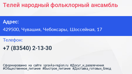 Телей, народный фольклорный ансамбль по адресу 429500, Чувашия, Чебоксары, Шоссейная, 17 в дальнейшем Организация, размещена в следующих категориях: