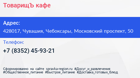 ТоварищЪ, кафе по адресу 428017, Чувашия, Чебоксары, Московский проспект, 50 в дальнейшем Организация, размещена в следующих категориях: