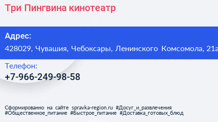 Три Пингвина, кинотеатр по адресу 428029, Чувашия, Чебоксары, Ленинского Комсомола, 21а в дальнейшем Организация, размещена в следующих категориях: