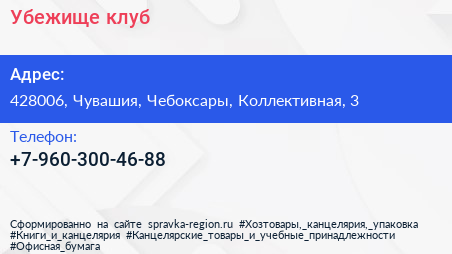 Убежище, клуб по адресу 428006, Чувашия, Чебоксары, Коллективная, 3 в дальнейшем Организация, размещена в следующих категориях: