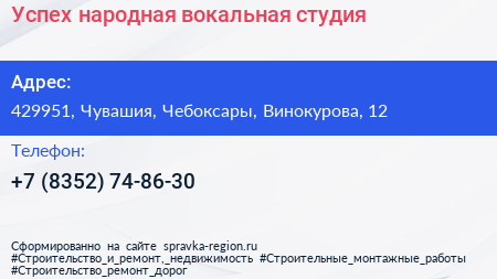 Успех, народная вокальная студия по адресу 429951, Чувашия, Чебоксары, Винокурова, 12 в дальнейшем Организация, размещена в следующих категориях: