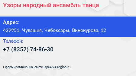 Узоры, народный ансамбль танца по адресу 429951, Чувашия, Чебоксары, Винокурова, 12 в дальнейшем Организация, размещена в следующих категориях: