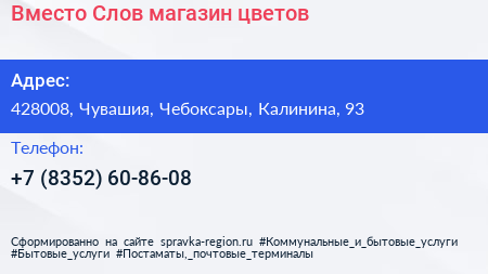 Вместо Слов, магазин цветов по адресу 428008, Чувашия, Чебоксары, Калинина, 93 в дальнейшем Организация, размещена в следующих категориях: