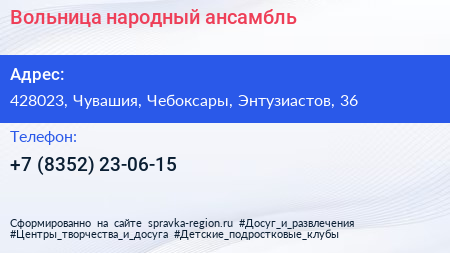 Вольница, народный ансамбль по адресу 428023, Чувашия, Чебоксары, Энтузиастов, 36 в дальнейшем Организация, размещена в следующих категориях: