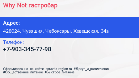 Why Not, гастробар по адресу 428024, Чувашия, Чебоксары, Хевешская, 34а в дальнейшем Организация, размещена в следующих категориях: