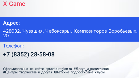 X.Game по адресу 428032, Чувашия, Чебоксары, Композиторов Воробьёвых, 20 в дальнейшем Организация, размещена в следующих категориях: