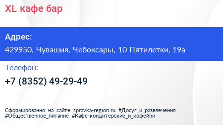 XL, кафе-бар по адресу 429950, Чувашия, Чебоксары, 10 Пятилетки, 19а в дальнейшем Организация, размещена в следующих категориях: