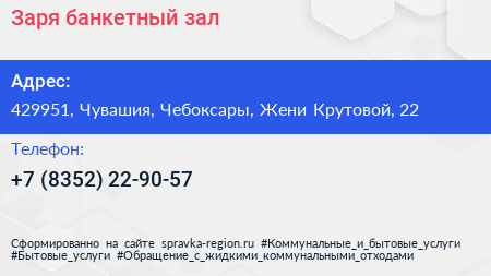 Заря, банкетный зал по адресу 429951, Чувашия, Чебоксары, Жени Крутовой, 22 в дальнейшем Организация, размещена в следующих категориях:
