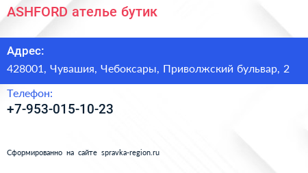 ASHFORD, ателье-бутик по адресу 428001, Чувашия, Чебоксары, Приволжский бульвар, 2 в дальнейшем Организация, размещена в следующих категориях:
