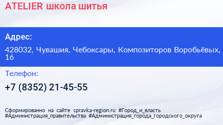 ATELIER, школа шитья по адресу 428032, Чувашия, Чебоксары, Композиторов Воробьёвых, 16 в дальнейшем Организация, размещена в следующих категориях: