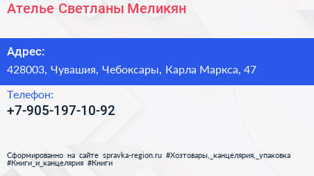 Ателье Светланы Меликян по адресу 428003, Чувашия, Чебоксары, Карла Маркса, 47 в дальнейшем Организация, размещена в следующих категориях: